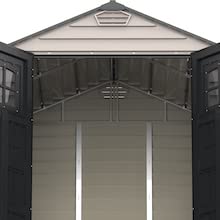 Heavy duty plastic floor included | 2 fixed windows on doors | Door handles with padlock eyes | Strong metal structure tested for 20 lbs/sq. ft. Snow load |