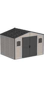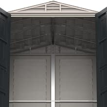 Heavy duty plastic floor included | Ventilation system as slotted grill on gable fascia | Door handles with padlock eyes | Strong metal structure tested for 20 lbs/sq. ft. Snow load |