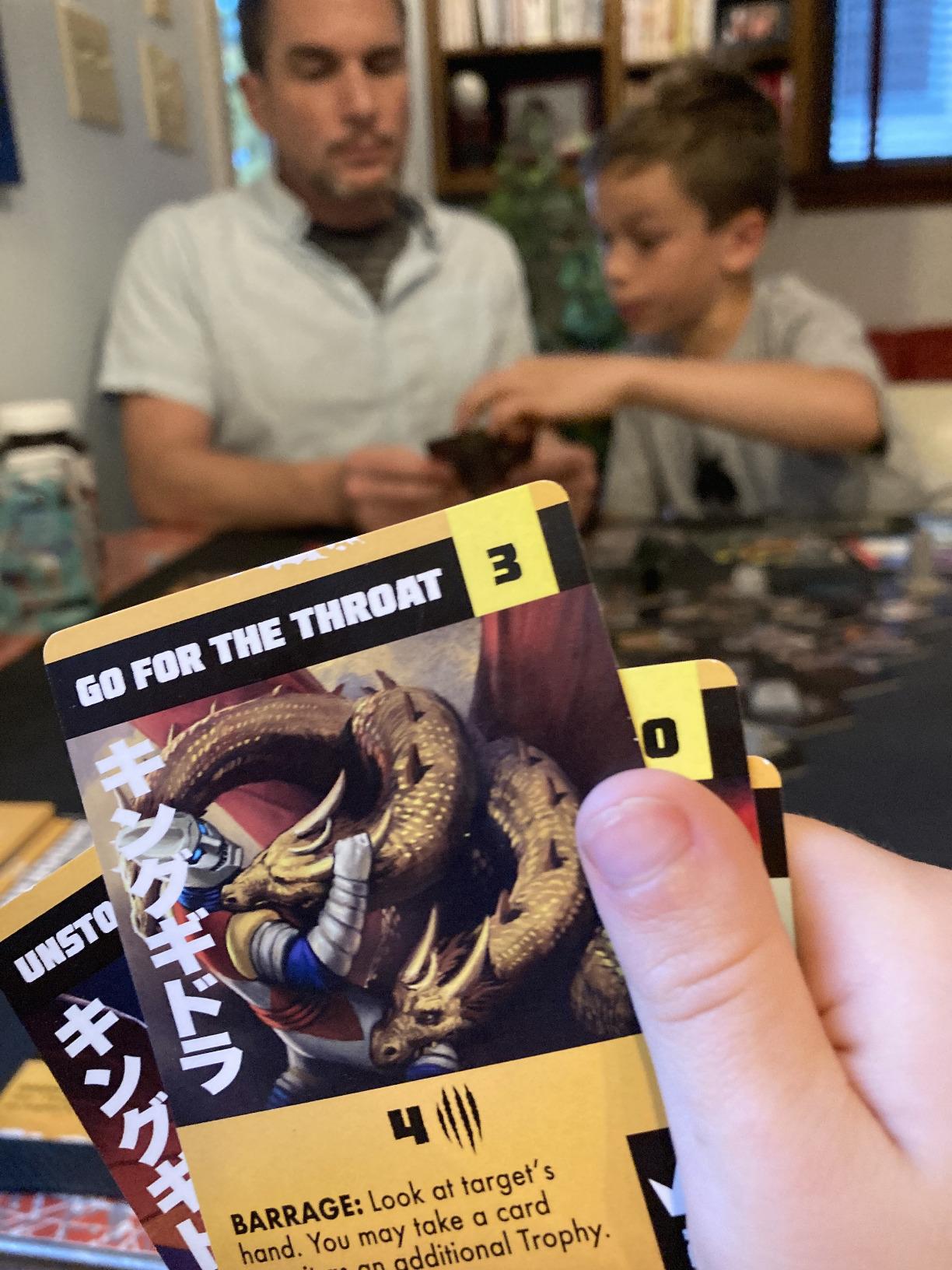 I really enjoyed it and would recommend it to Godzilla fans. Potentially a family game, probably 10+ if i had to guess. And nobody is knocked out of the game. The fight goes on round for round and victory points determine the outcome so everyone gets to keep playing until the end.