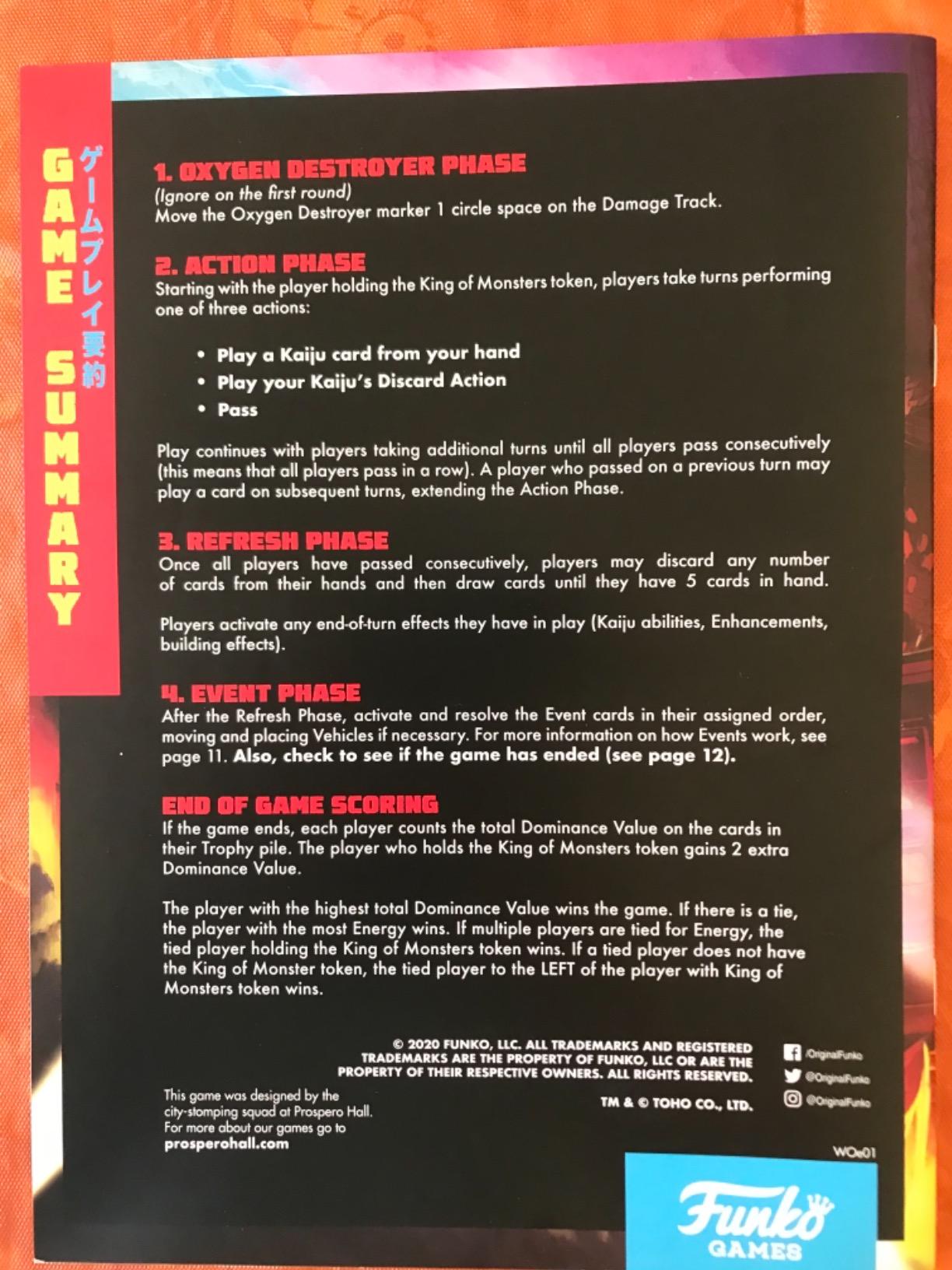 The actual gameplay is really fun, gaining energy to use attacks to fight other players. Each kaiju also has abilities that don’t cost energy which means that even players who don’t have any energy can participate in the action. It’s actually a pretty simple system to understand and within one game my sister understood the rules as well as I did without even reading the manual. As a convenient addition the back cover of the manual has the steps of every turn so you can very easily look to it if you forget what’s next.
