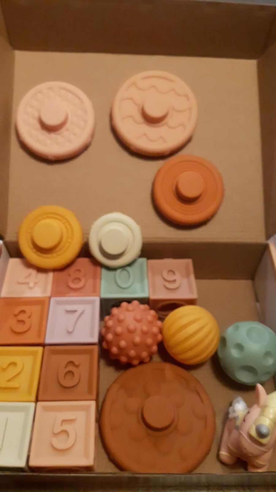 The box includes a stacking rings toy that can be topped with a unicorn, three squeaky sensory balls (might be wise to keep these away from your dog if you have one!! 😉 ) and ten rubber blocks which stack according to the numbers and shapes on them.