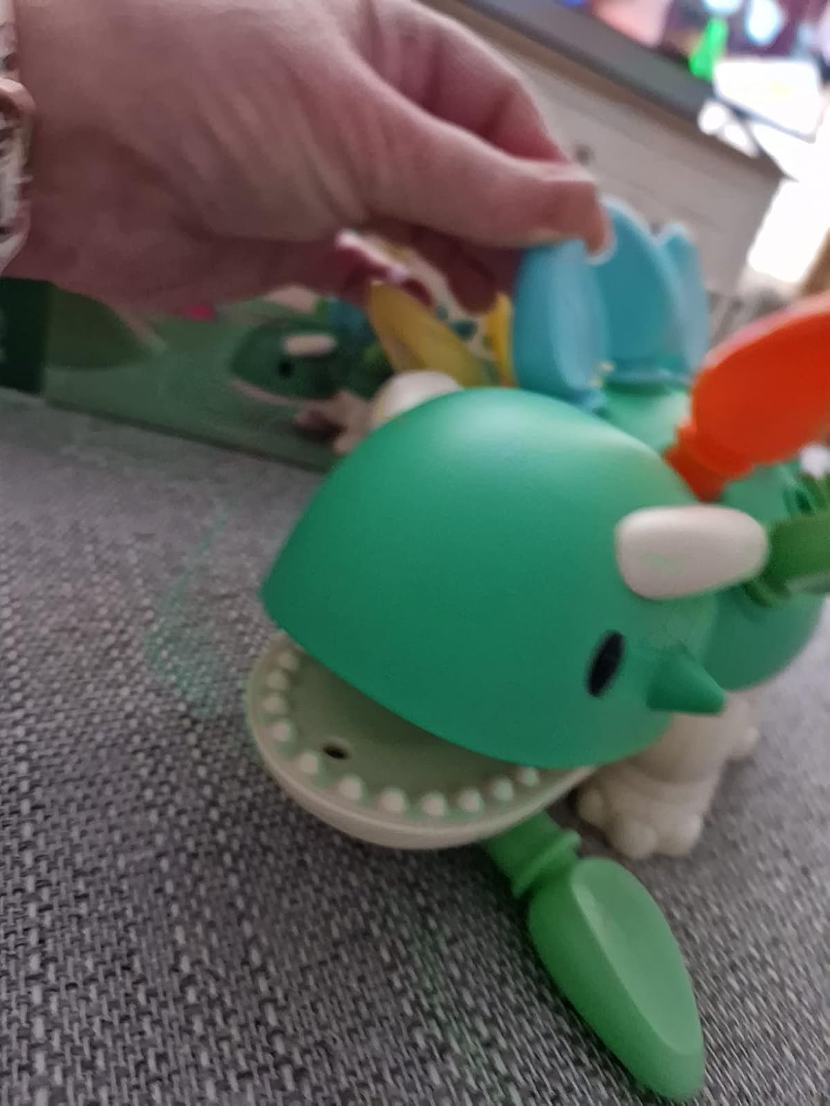 It’s a plastic dinosaur with holes in to push the spikes. It’s nothing special. If you push the spikes it behind the head the mouth opens. All children like to push things in holes so they enjoy it. All the spines can be kept inside. I can see it getting boring quickly though. I guess I could add a dice with colours on and make a game with it later on.