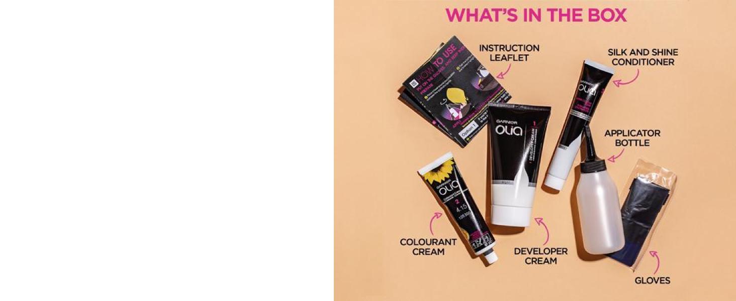 - A colourant cream, applicator bottle, developer cream, gloves & an instruction leaflet