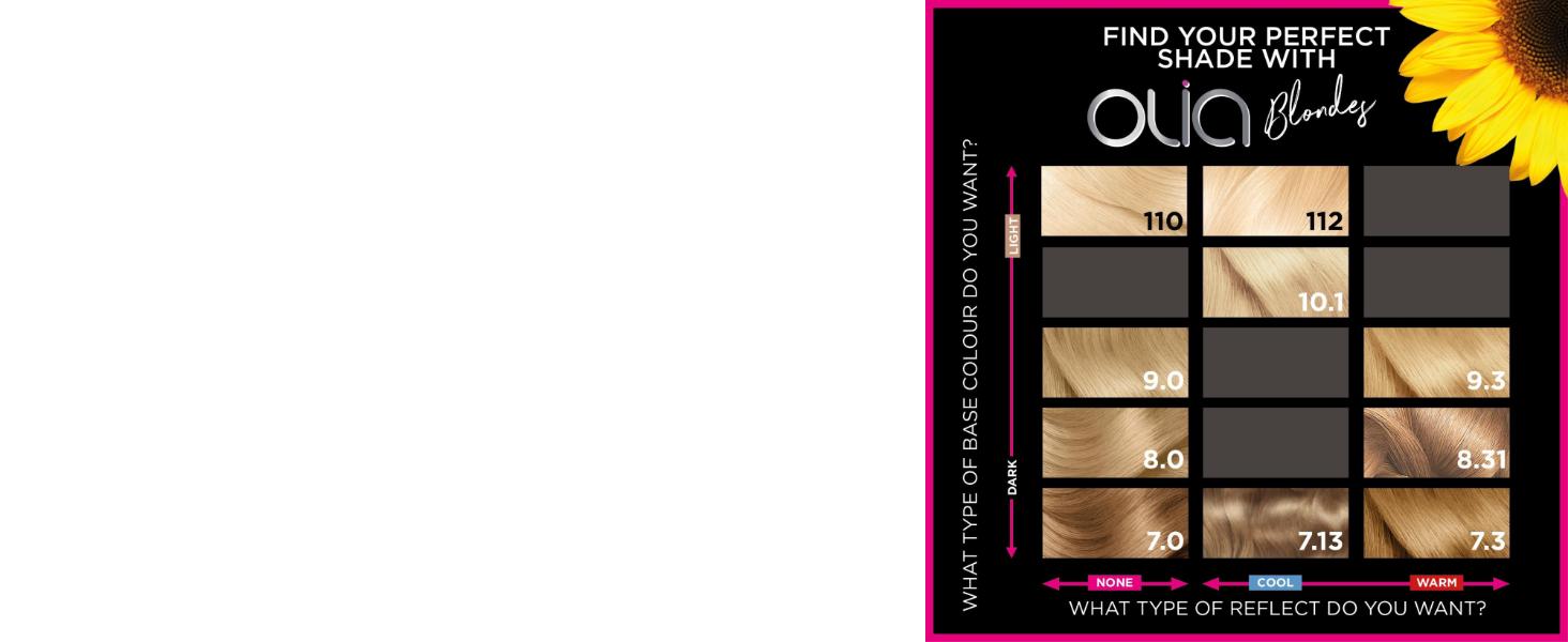 Garnier Olia permanent hair dye is a 60% oil-powered formula, with natural flower oils and ammonia free for a pleasant scent. Olia at home hair colour will provide up to 100% grey hair coverage and maximum colour performance for lavish, vivid and long-lasting blonde hair. Our at home hair dye visibly improves the quality of hair, for making hair 3x shinier**.