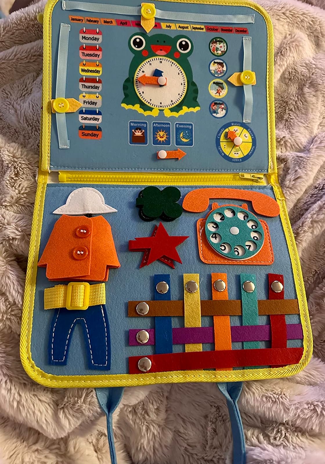 This HitTopss Busy Board is a 25 in 1 Montessori toy is fantastic. It’s kept the kids entertained for hours! It’s made from a felt material and it has a really nice feel to it. It also has handles so you can carry the board around like a book bag.