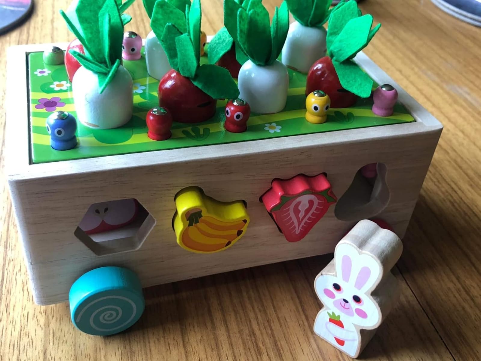 This is a cute wooden toy that’s got various activities such as shape sorting and using the rabbit to catch the bugs via a magnet.