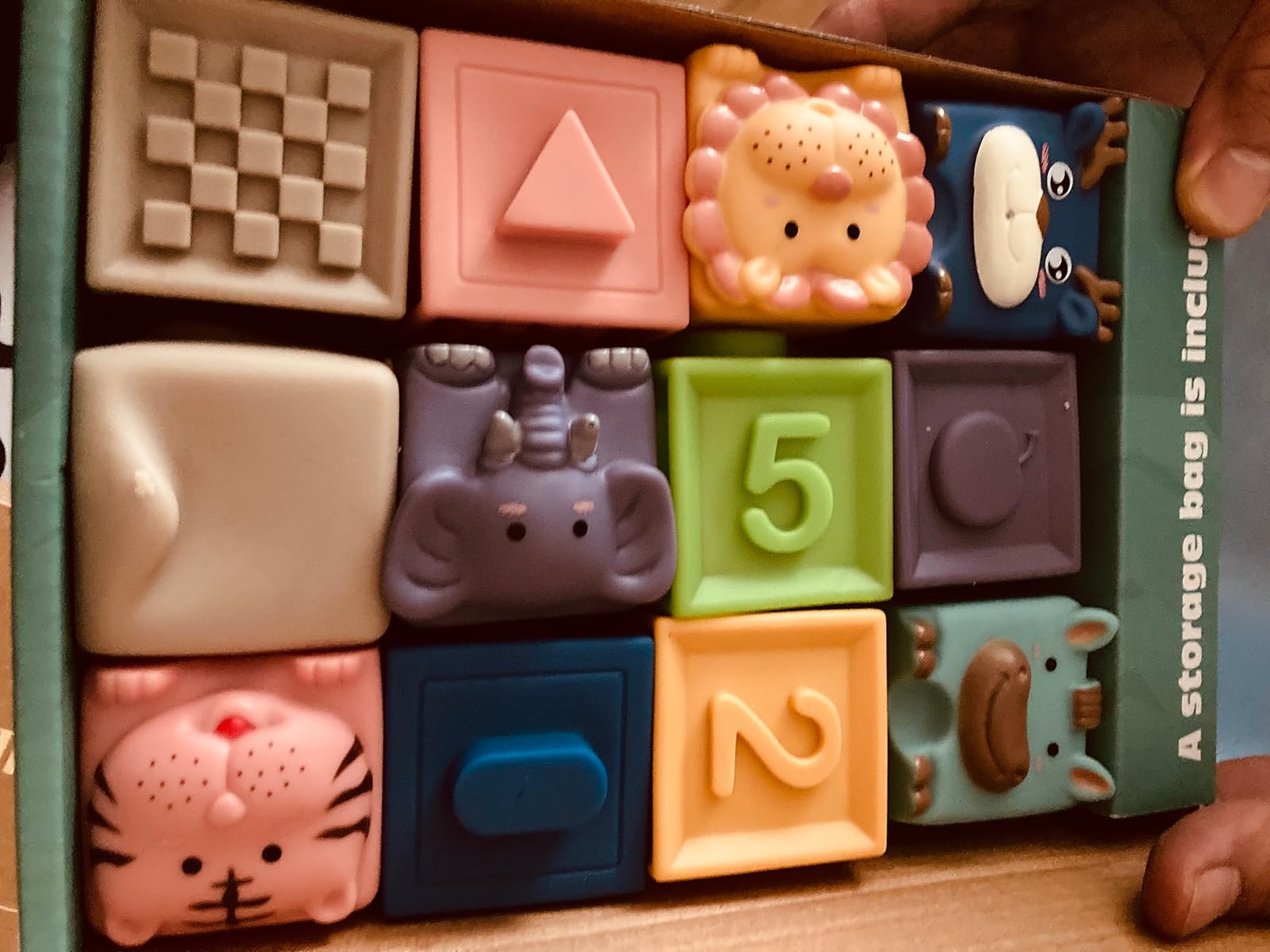 These are quite nice and well made teething toys for babies. These are pack of 12 pcs. 6 pieces are animals shapes and 6 are cubes. Babies love to bite the soft toys always so these are safe for babies to bites them. It’s perfect for gift too.