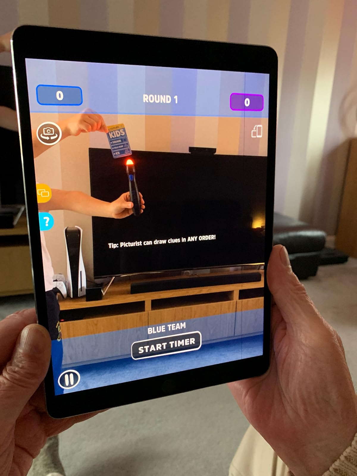 The installation of this game is not too difficult. We use iPad as we don’t have a camera connected to our TV. An App needs to be first downloaded to our iPad. We use the front camera to play so the player can see what they are drawing and have the other players guessing. The app shows the time and scoring and clear of drawings can be done by taping on the screen.