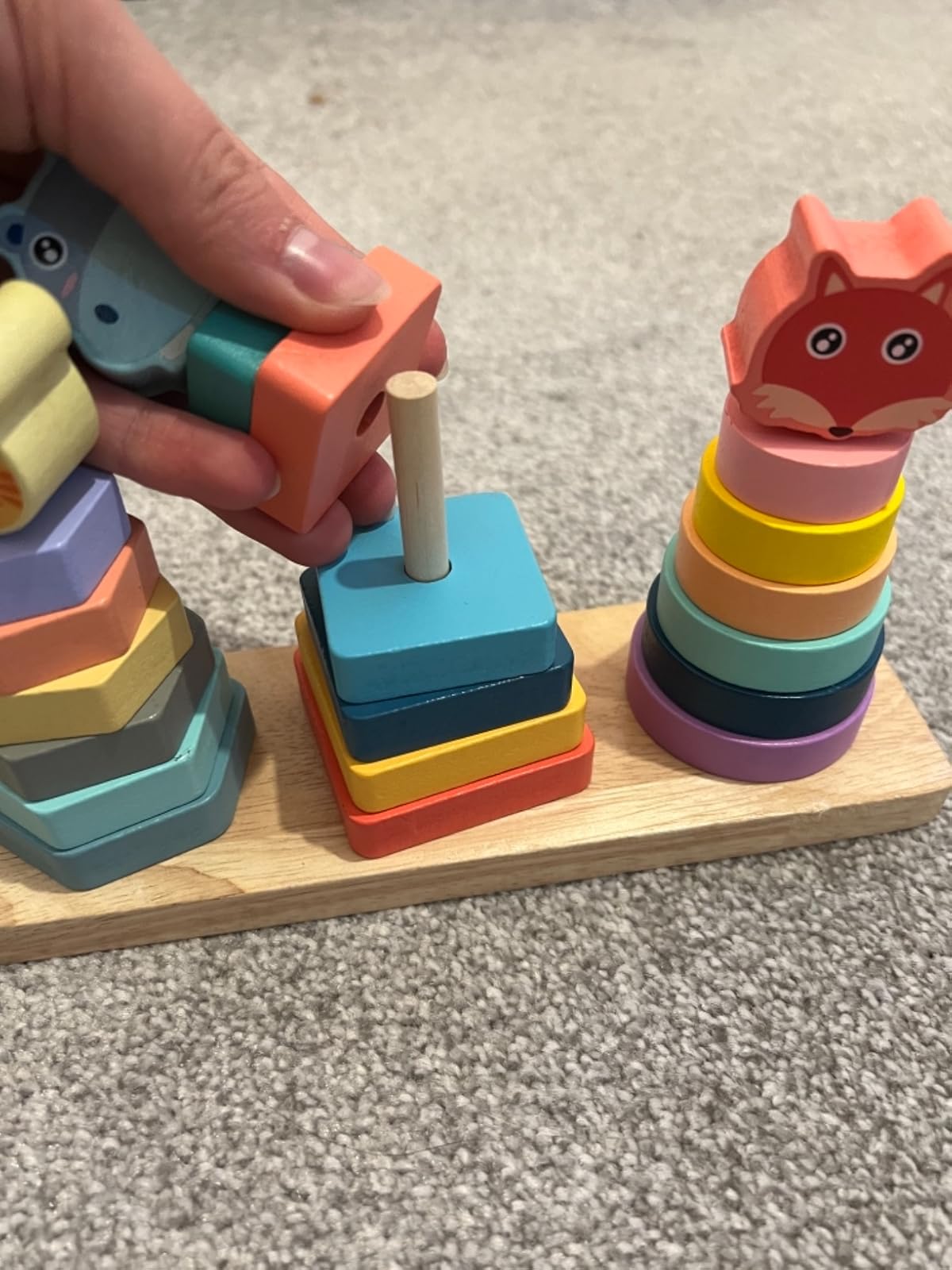 My 2 year old son absolutley loves this toy! He spends hours stacking the shapes on the posts, honestly I’ve never seen him so fascinated as when I first showed him this toy! Super educational as well as helps them correlate colours, shapes and sizes together and really gets their brain working! 10/10 for this definitely recommend. Such a sturdy and pretty looking toy as well!