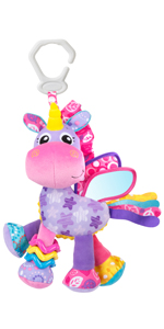 My 14 week old daughter loves this and it is one of her favourite toys to play with. She likes the nice face of the unicorn and all of the things that it has like crinkly feet, mirror wings, ‘bracelets’ round an ankle etc. Would highly recommend 🙂