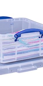 As they are also clear, you can see what’s in them as well, although for stacked boxes a label stuck on the front is very helpful. I am buying more at the moment as I am preparing for a house move and am using these for fragile items as well as heavy things like books. The 35 litre box is just right for the latter as it doesn’t get too heavy even when fully loaded.