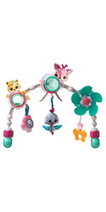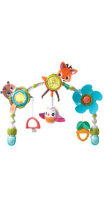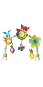 This play arch has been an absolute God send! My 3 month old baby used to regularly have meltdowns in the car but this toy has really helped. She seems to be obscessed with the deer figure and always gives him a smile when we attach it to our Kiddy car seat. Also used it on our uppababy pram today and it kept her occupied for a good 30 minutes whilst we were at the restaurant.