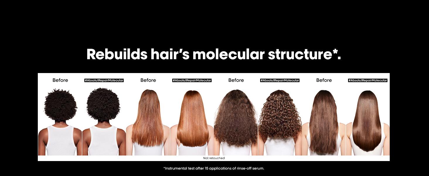 Rebuild the hair molecular structure. Restore strength , elasticity & movement .