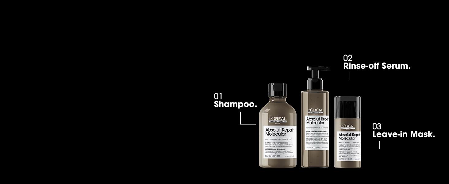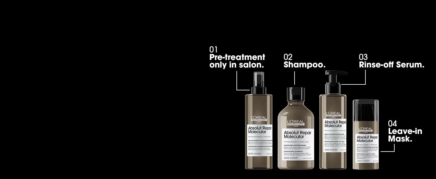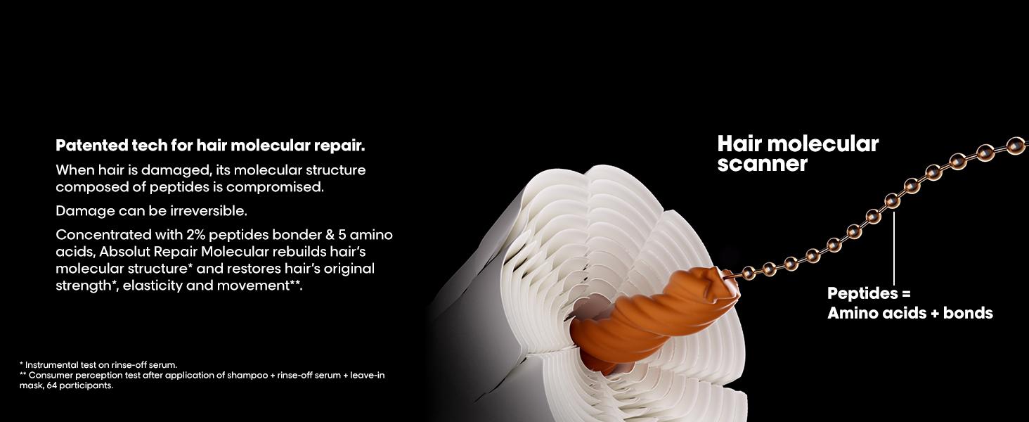 Absolut Repair Molecular is concentrated in Peptides bonder + 5 Amino Acids to rebuild the hair molecular structure*.