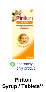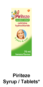 | Essential Information | * Piriteze Allergy Syrup and Piriteze Allergy Tablets contain cetrizine hydrochloride.Always read the label. | ** Piriton Syrup and Piriton Allergy Tablets contain chlorphenamine maleate. Always read the label. | *** Pirinase Hayfever Relief 0.05% Nasal Spray containsfluticasone propionate.Always read the label. |