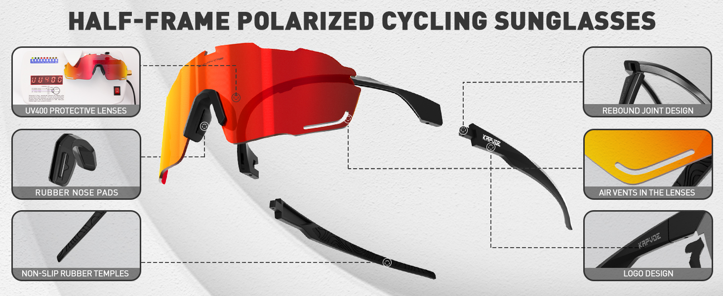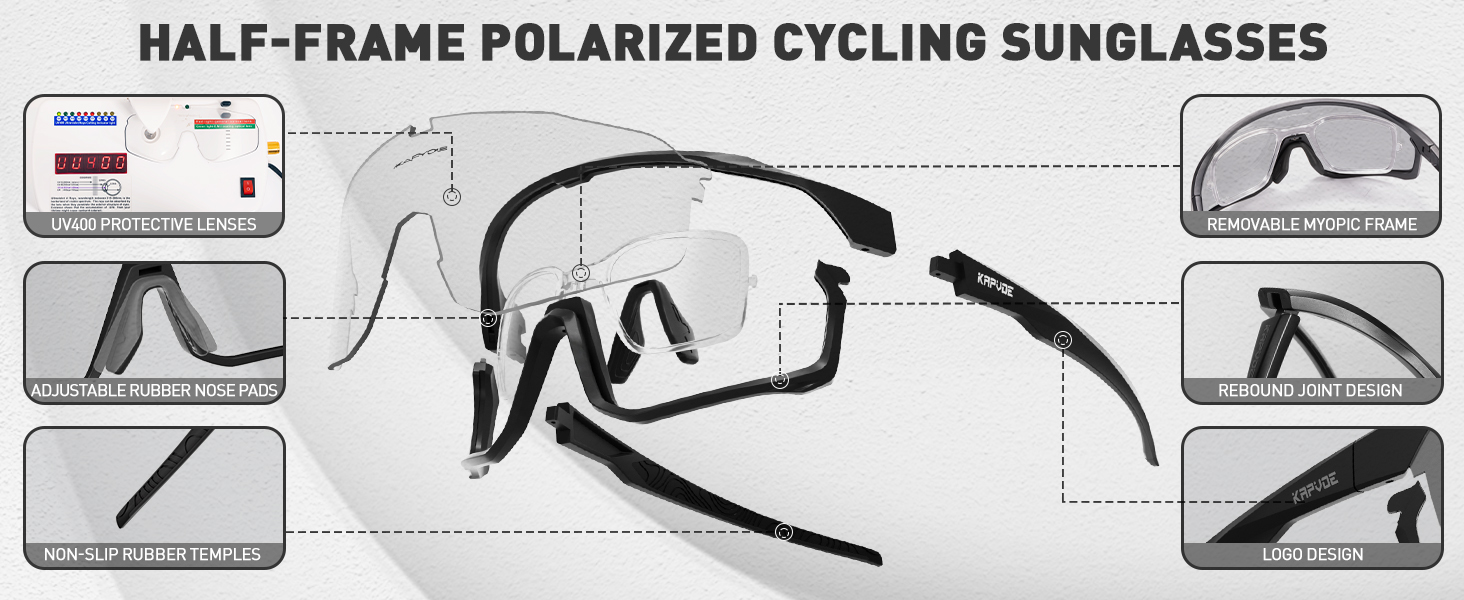 The KAPVOE Cycling Glasses make a solid first impression with their professional packaging and comprehensive set of accessories. The option of a full-frame model with photochromic lenses and a half-frame model with colored polarized lenses. The glasses’ design is both stylish and functional, suggesting suitability for a range of outdoor activities.