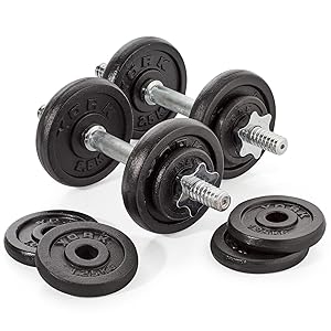 This was my first venture into buying weights and these have fulfilled and surpassed my expectations! I started initially using just the largest of the 3 discs, 2 per dumbbell and have progressed now to using the largest and the middle sized discs, 9kg per dumbbell.
