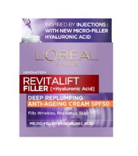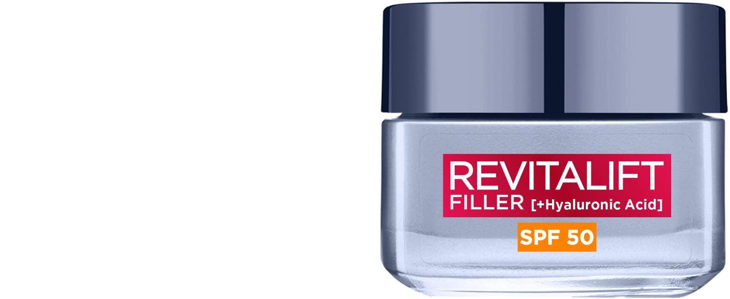 L’Oréal Paris Revitalift Filler Deep Replumping Anti-Ageing SPF50 Cream, UV Protection, Moisturising, Intensely Hydrates and Smooth Wrinkles with Macro, Micro and Micro-Epidermic Hyaluronic Acid, 50ml
