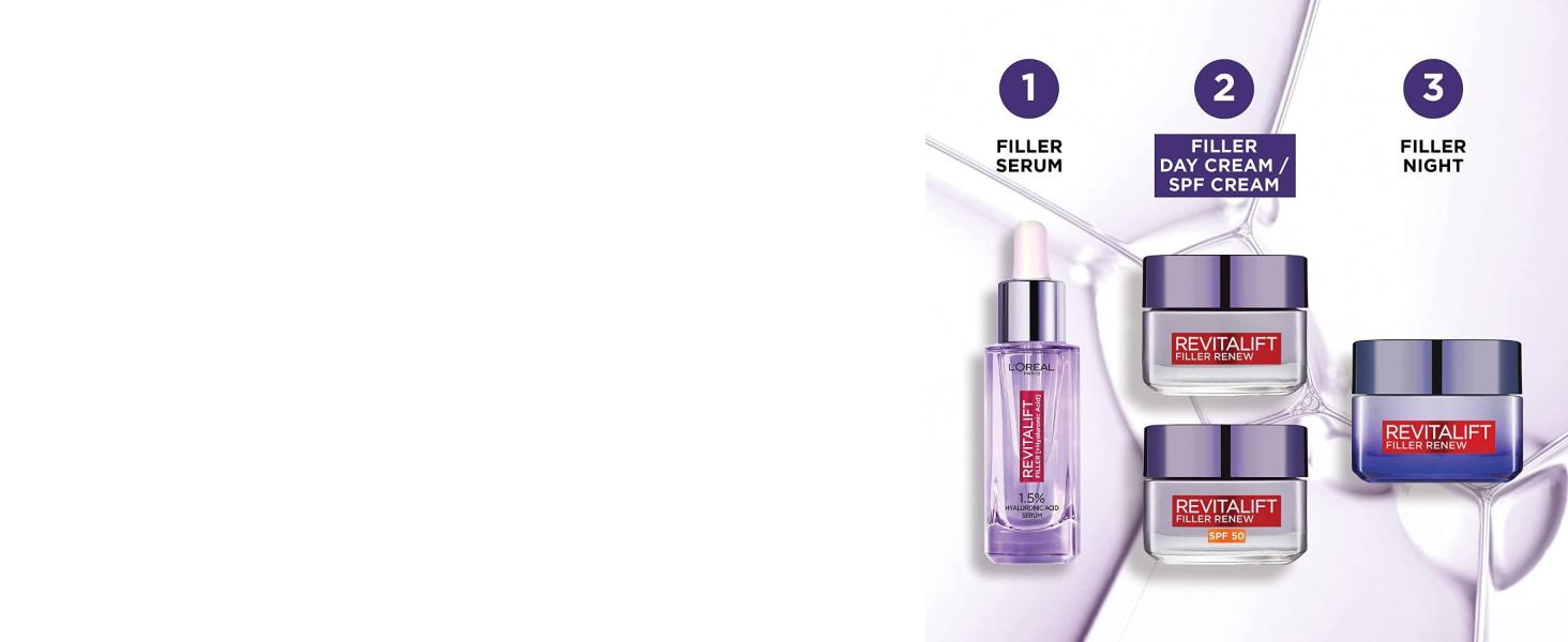 Discover Revitalift Filler + Hyaluronic Acid, L’Oreal Paris Anti-Wrinkle + Replumping regime.