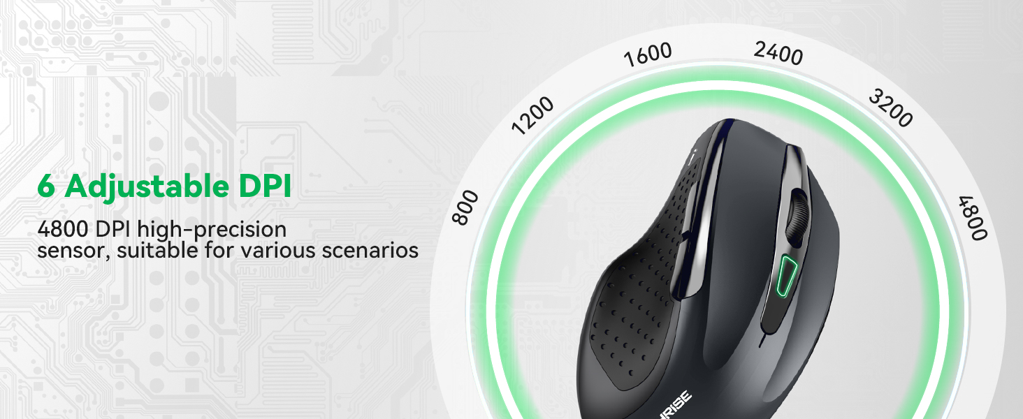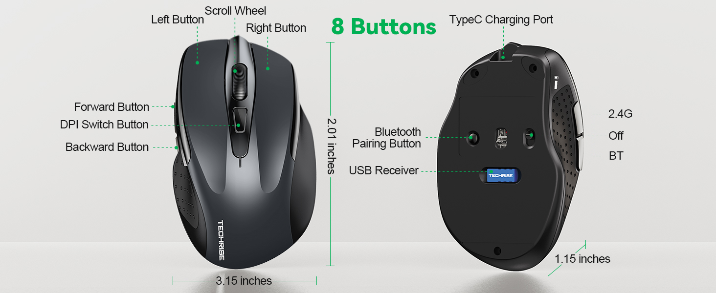 TechRise Wireless Mouse, Rechargeable Bluetooth Mouse (BT5.0/3.0 & 2.4G), 4800DPI Adjustable, 8-Button Silent Computer Mice, Ergonomic Wireless Mouse for Laptop PC Mac, Grey