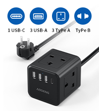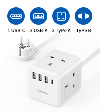 UK to European Plug Adapter with 1.5M Extension Cable, Aodeng 4 Way Travel Extension Lead with 4 USB Compact Cube Type E/F Travel Adapter for Germany France Spain Poland Greece Netherlands etc.