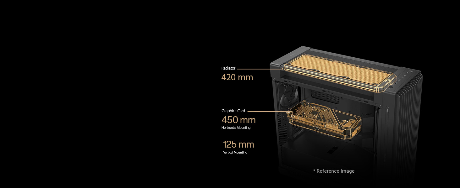 Sufficient space for the beefiest graphics cards. Also supports one 420 mm radiator.
