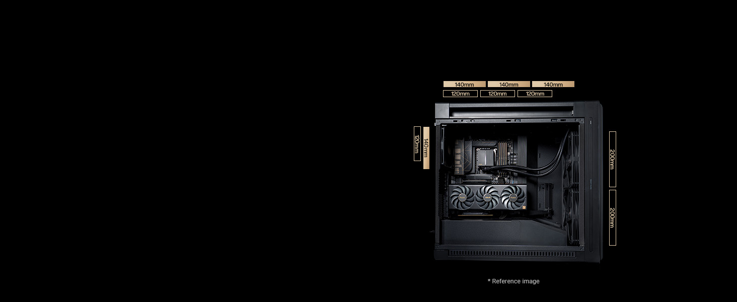 Built in with 200 x 38 mm front fans and 140 x 28 mm rear fan.