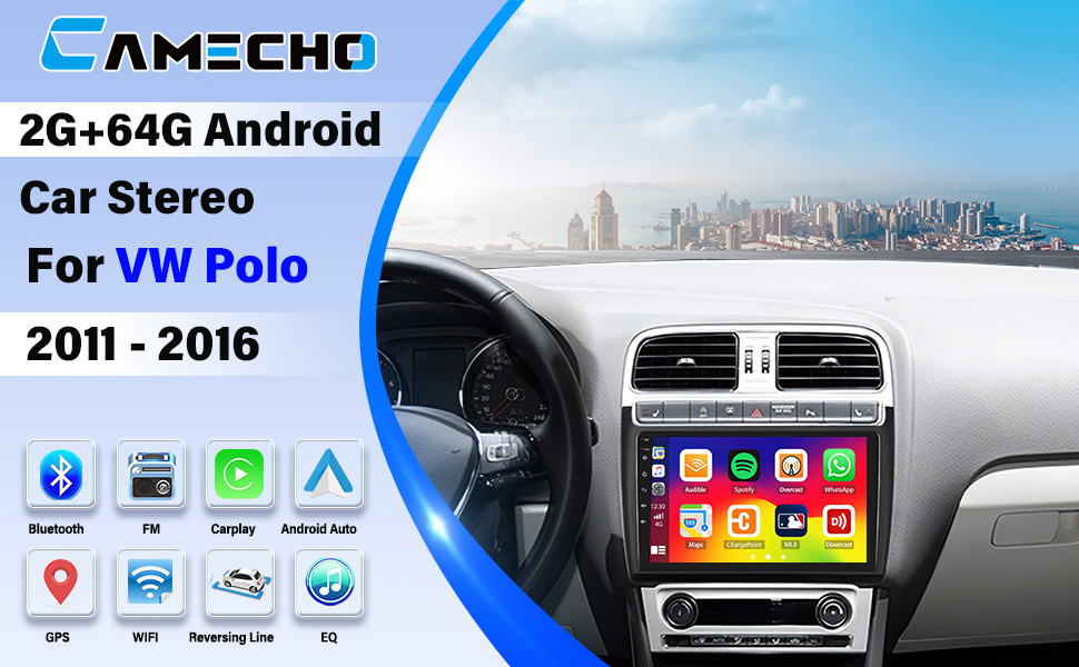 CAMECHO 2G+64G 9 Inch Android 13 Car Stereo for VW Polo 2011 2012 2013 2014 2015 2016, Wireless Carplay Android Auto Mirror Link Touchscreen GPS Navigation Radio with Bluetooth WiFi Reverse Camera