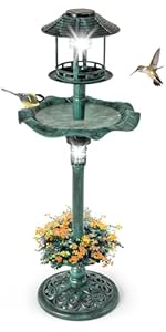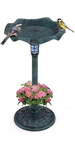 Enhance your outdoor retreat with our versatile solar bird bath! Powered by sunlight, the built-in panel lights the LED lamp for 8 hours at night, creating a serene ambiance and attracting birds. Our metal birdbath features a 3-in-1 design: a flower-shaped tray for feeding birds, a lotus leaf bowl for bathing, and a planter with 6 drainage holes for healthy plant growth. Crafted from durable sprayed metal and easy-to-clean PP, maintenance is a breeze.