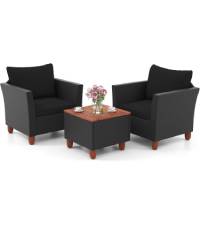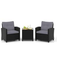 RELAX4LIFE 3 Pieces Outdoor Rattan Bistro Set, Patio Wicker Conversation Furniture Set with Cushions & Tempered Glass Tabletop, Metal Frame Garden Conservatory Sofa Table for Porch Balcony (Black)