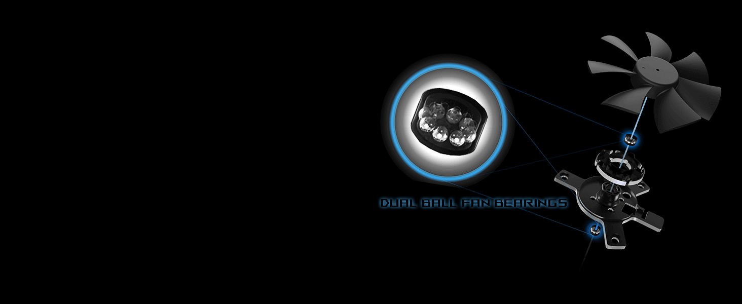Dual ball bearings boast a remarkable lifespan of 80,000 hours, lasting longer than sleeve bearings and fluid dynamic bearings. Ensuring reliable cooling with minimal noise for ROG STRIX Platinum.