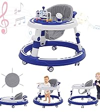 Baby Walker 4-in-1 Foldable Multi-Function Walkers Round Shape Walkers with Light Song and Sound Anti-Rollover Baby Seat with Adjustable Height Child Walking Chair Foot Pads for Girls Boys