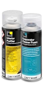 | Features and Benefits | Removes contaminants and bad odours from all cabin surfaces, including hard-to-reach areas: seats, mats, plastic surfaces, and the A/C system. Improves air quality. | The foam adheres perfectly to the surfaces of the A/C system. To clean and purify vehicle A/C systems, insert the 60 cm nozzle into the air vents or the condensate drain. | Evaporator Cleaner Foam: the foam adheres perfectly to the surfaces of the A/C system for deep cleaning. Interior Purifier: removes contaminants from all cabin surfaces and improves air quality. |