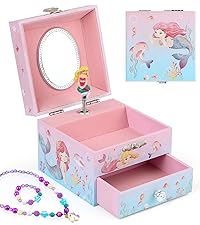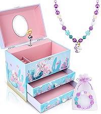 Musical Jewellery Box for Girls – Blue Memaid Music Box with 2 Pullout Drawers, Kids Jewellery Box Gifts for Girls, Children Birthday Presents for Ages 3-1
