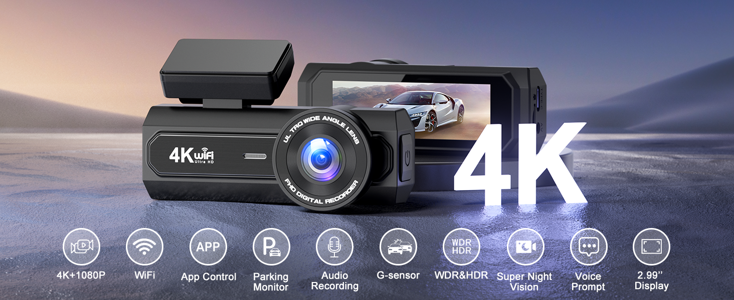 DYNACAM Dash Cam 4K+1080P, WiFi Dash Cam Front and Rear, Car on-dash mounted cameras with Free 64GB Card, 2.99 IPS, 24/7 Parking Monitor, Dashboard Camera with Night Vision, G-Sensor, WDR, APP