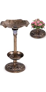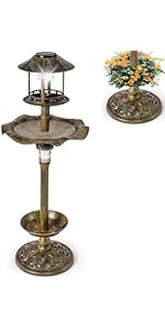 - The standing bird bath features a solar-powered LED light, which can store energy during the day and illuminate in the evening.