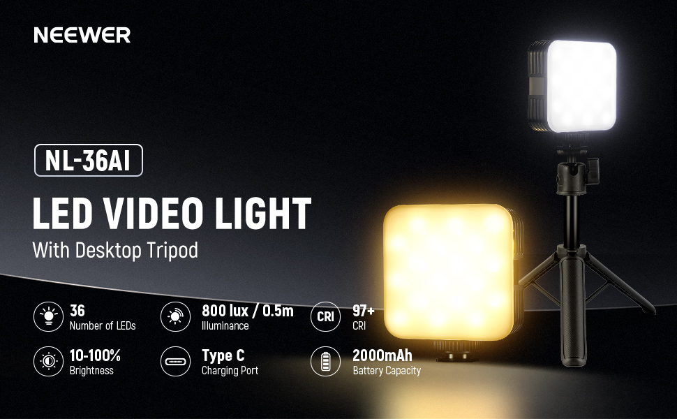 NEEWER LED Camera Video Light with Desk Tripod Stand, Portable Bi Color 3200K-5600K Dimmable Small Panel Lighting, CRI 97+ 8 Scenes 2000mAh Rechargeable Battery for Vlog Recording Photography, NL-36AI