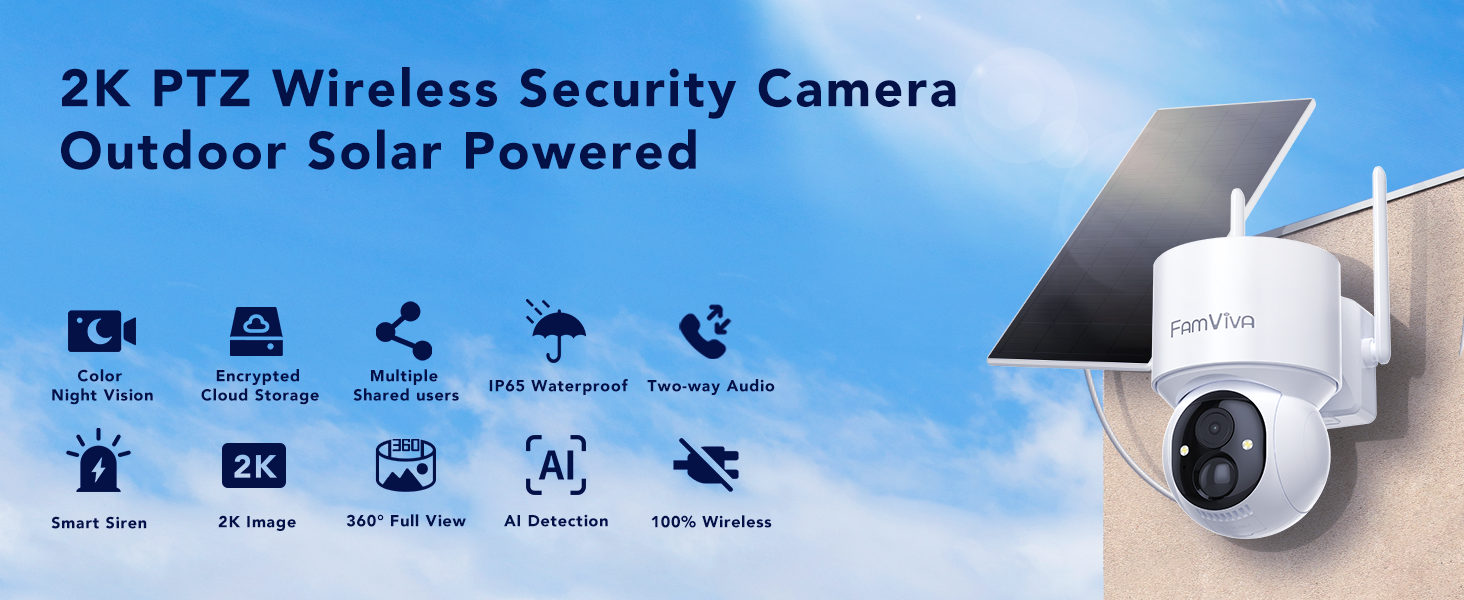 FAMVIVA 2K Solar Security Cameras Wireless Outdoor, 360°PTZ