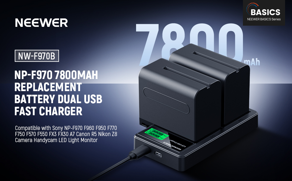 NEEWER Basics 2Pcs NP-F970 7800mAh Replacement Battery Dual USB Charger Compatible with Sony NP-F970 F960 F950 F770 F750 F570 F550 FX3 FX30 A7 Canon R5 Nikon Z8 Camera Handycam LED Light Monito