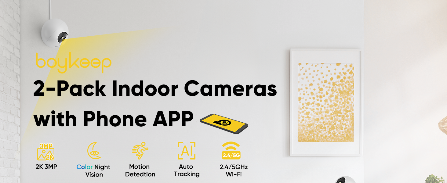 BoyKeep 2K Surveillance Cameras for Home Security, 2-Pack Indoor Camera with Night Vision, Pet Camera Indoor with App, Motion Detection, 2-Way Audio, Cloud/SD Card Storage, Compatible with Alexa