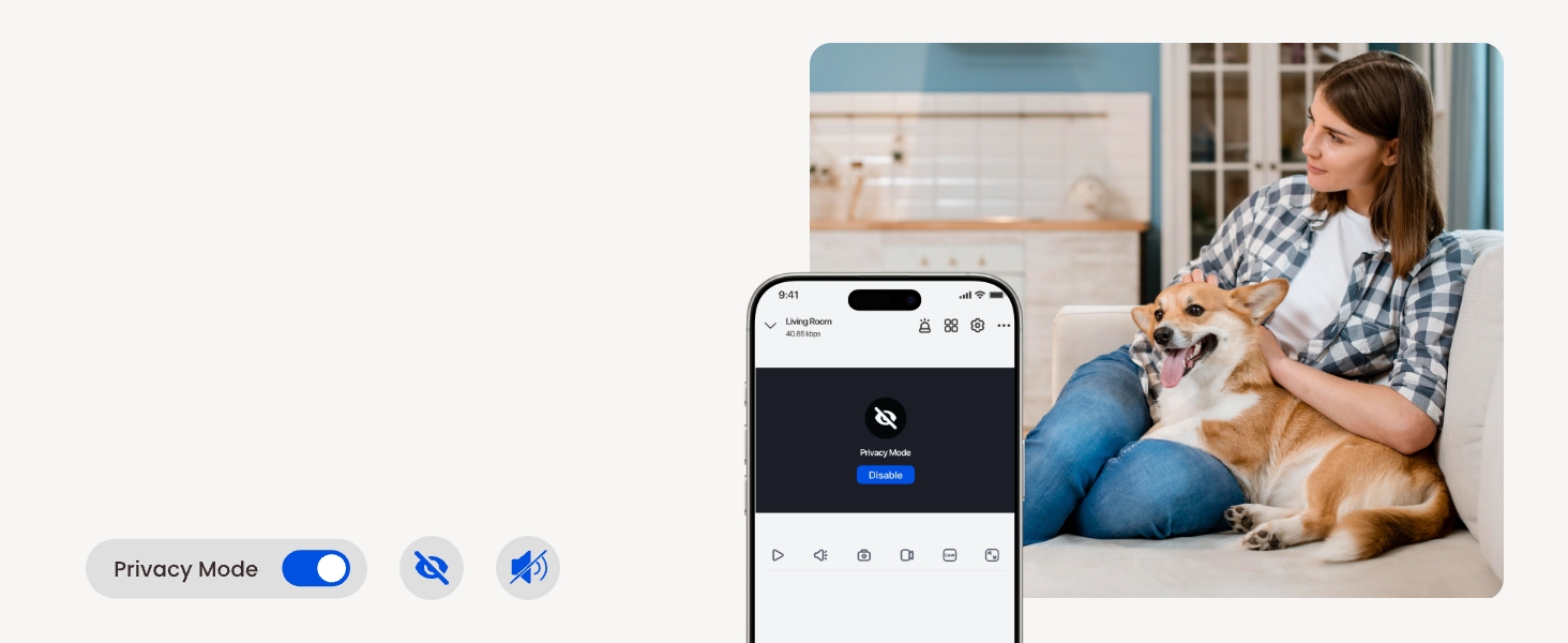 Activate privacy mode to block or disable the camera’s view and sound when you need to protect your space. Easily manage your security needs.