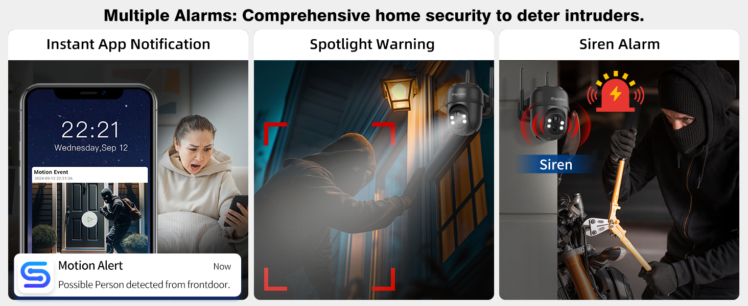 Spotlight WarningThe WiFi camera activates bright lights to warn off intruders.