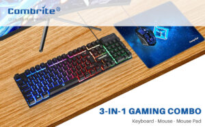 Combrite Raptor Gaming Keyboard And Mouse Set With Large Mouse Pad, Rainbow LED Illustrated Keys, USB Wired Desktop Combo, UK Layout, For PC, Laptop, PS4, PS5, Xbox One, Black
