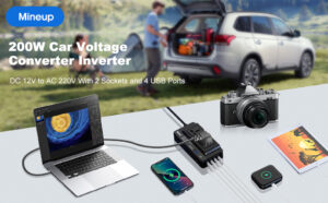 Mineup 200W Car Voltage Converter, Inverter DC 12V to AC 220V with 2 Sockets and 4 USB Ports, Car Power Inverter with LED Voltage Display and Cigarette, Fast Charging for Business Trips and Vacatio