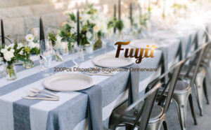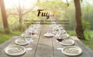 Fuyit 200pcs Disposable Tableware Set, Compostable and Biodegradable Sugarcane Bagasse Eco-Friendly Dinnerware Kits Includes Paper Plates, Forks, Knives and Spoons for Party, Camping, Picnic