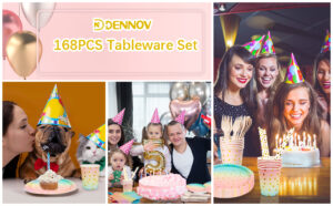 DN DENNOV Rainbow Colors Party Tableware 168Pieces Paper Tableware Set Includes Paper Plates Napkins Cups Forks Spoons for Wedding Shower Engagement Wedding Birthday (24 Guests)-Blue&Pink&Gold