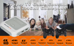TAPDRA Dual System Super Console X Pro Wireless Game Console with Dual 2.4GHz Gamepads, Perfect Gifts for Men, Boy Super console x is the perfect latest TV game console. 51000+ Games, 50+ Emulators 1.Equipped with game system and TV system,support playing games,download Apps, searching information and watching TV online. 2. S905X chip, much more powerful,run 64 bit games smoothly,high configuration and fast speed. 3. Plug and play, much more fun,Our game console can save game progress. 4. Open source system, support add games by yourself (Provide video instruction to help you add games). 5. Android 7.1 system, apk can be installed and uninstalled, unlimited. 6. Support LAN/WIFI network connection, easy to downloadable games via LAN/WIFI. 7. Support up to 4K@60Hz output, 1080/720 HDMI HD output,If needed, please send us to get a list of games. 8. Support up to 4 players at the same time,so you can enjoy multiplayer games with family or friends. Super Console X Pro Retro Video Game Console With 51000+ Games With Wireless Controllers Using open source Linux system Support LAN/WIFI network connection to download apps. How to Change Game System to TV System ? Please Press the controller’s button “Start” , Then select the ” Quit”, Next select the “REBOOT FROM HAND”, and will change to the tv system, you can watch tv online or download apps. Support up to 4 players Support up to 4 players at the same time, equipped with 2PCS 2.4Ghz wireless game controllers. S905M chip The upgraded “S905M chip”, more powerful, it is better than RK3326chip, solved the frame drop problem, can run 64bit games well. Package Included 1 x Super Console-X ; 2 x Controller ; 1 x 256 GB SD Card ; 1x USB Connector ; 1x Power Supply ; 1x HDMI Cable ; 1 x User Manual Question 1 Our game console support HDMI / AV Output both 2 Modes, the package only have HDMI cable, not included the AV cable. Question 2 The console has voice. The volume of the console is controlled by your TV equipment, not controlled by console. Question 3 The USB Connector is used for linking the wireless controllers to game console. Question 4 If you want to use it for your computer, You need to convert HDMI to VGA, need a VGA cable. Question 5 Our game console can save game progress. Please note that it is so small and packaged in the game controllers’ back battery case. (Only one USB Connector , it can used for 2 controllers. sometimes 2 usb Connectors ) (This package is not included the battery, please buy extraly) Check Offer Price Dimensions: 22.1 x 17.1 x 11.4 cm; 738 Grams Batteries Required: No Batteries Included: No Reference: B014000003