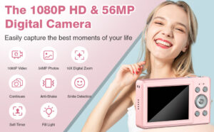 Upgrade Digital Camera, 56MP FHD 1080P for Kids with 16x Zoom Anti Shake, 32GB TF Card, Two Batteries, Lanyard, Compact Small for Boys Girls (Pink)