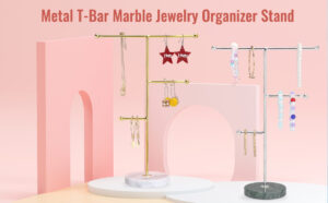 Jewelry Organizer,Metal T-Bar Necklace Display Stand Earrings Holder for Home, Hanging Pendant Rack with Marble Pattern Round Tray for Bracelets Rings Watches (A-Gold)