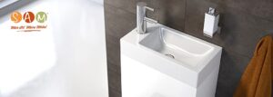 SAM Door with Push-Open Function, Small washbasin with Plastic Basin, MDF, White, 40 x 22 x 58 cm